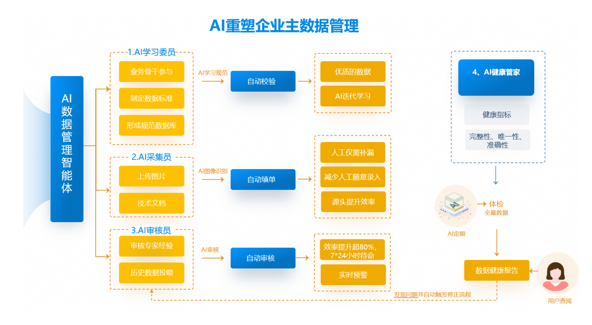 AI不再是生硬的对话工具,而是化身您的“学习委员、采集员、审核员与健康管家”。先由学习委员沉淀业务标准,再交由采集员自动填单,告别繁琐手工;配合审核员7x24小时智能把关与健康管家定期的全量数据“体检”,让错漏无所遁形。四大Agent无缝衔接,主动发现并修正问题,为您轻松打造省心、可靠的底层数据环境。
