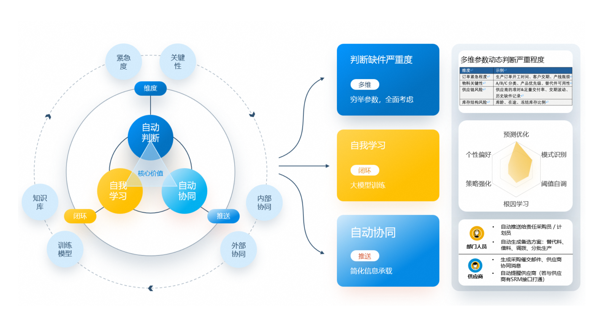彻底告别传统缺件报表的滞后性,化被动查询为主动协同。供应链缺件 Agent 综合订单紧急度与库存风险,动态评估缺料严重度;它不仅能自我学习优化预测,更会自动向计划与采购推送替代料、调拨等处理方案,甚至直连供应商,实现端到端的业务无缝闭环。