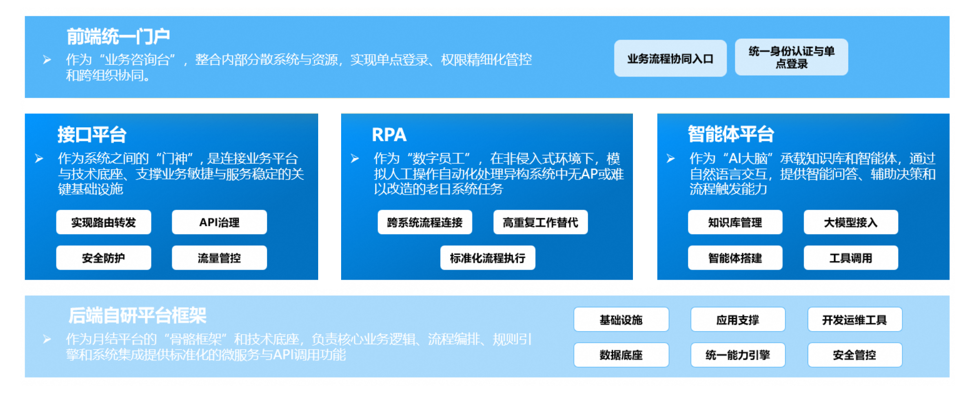 “后端微服务+前端统一门户+RPA自动化+AI智能体”的企业级数字化平台架构,通过三层架构实现从核心业务到自动化执行再到智能增强的闭环