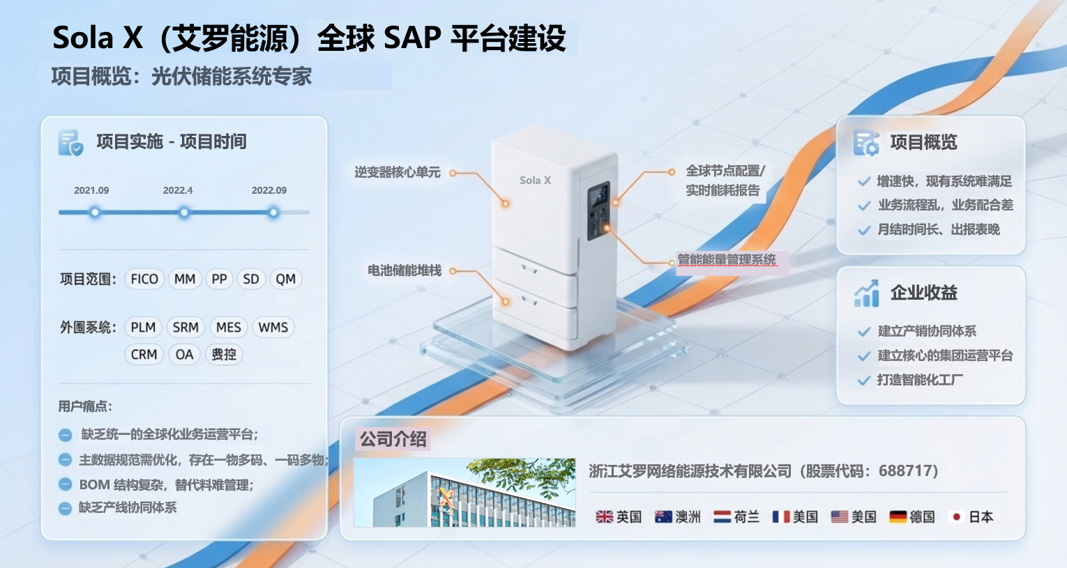 在艾罗能源全球平台建设中,项目深耕 SAP S/4HANA 全模块应用, 成功构建了支撑全球业务的数字化中枢。凭借主数据标准的统一与替代料模型的重塑,彻底消除一物多码痼疾,打通产供销全球协同体系。在实现全球节点实时可视的同时,赋能企业由流程乱象迈向规范运营,筑牢全球化数智底座。